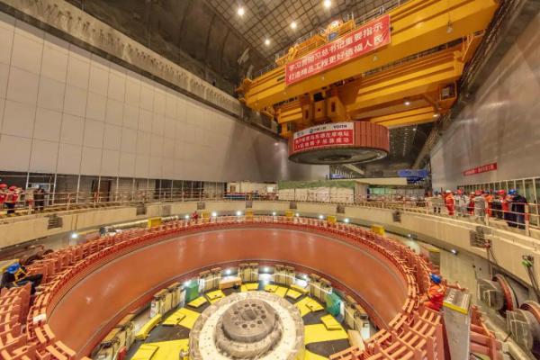 烏東德水電站是實施“西電東送”的國家重大工程,電站共安裝12臺單機容量85萬千瓦水輪發電機組,總裝機容量1020萬千瓦,其中8臺機組已于2020年投產發電。此次吊裝的2號機組轉子直徑17.49米,高度4.07米,由中心體、扇形體支架、磁軛及磁極組成,是烏東德水輪發電機組最重、最核心的部件之一,也是目前世界上在建水電站中最大的機組部件之一。