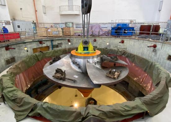 3月1日,隨著4號(hào)發(fā)電機(jī)轉(zhuǎn)輪在主廠房橋機(jī)的平穩(wěn)緩慢運(yùn)行及準(zhǔn)確定位下,順利安裝調(diào)整就位,標(biāo)志著由水電三局制造安裝分局承建的黃河大峽水電站4號(hào)機(jī)水輪機(jī)的增容改造工作取得階段性成果。